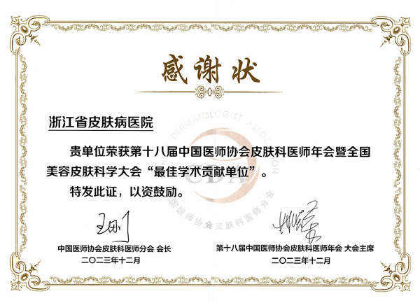12月7-10日,中国医师协会、中国医师协会皮肤科医师分会主办的“第十八届中国医师协会皮肤科医师年会暨全国美容皮肤科学大会”在上海国家会展中心举办。浙江省皮肤病医院被大会评为“最佳学术贡献单位”之一。