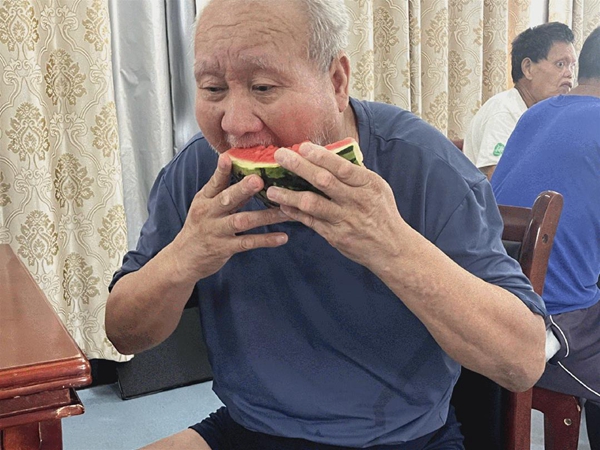 三伏天,气温居高不下,枝繁叶茂的香樟树下也透着热意。麻风村的活动室里,慰问组一行一起为麻风休养员们送上牛奶、鸡蛋、香皂、毛巾等慰问品,还为他们端来了清凉解暑的西瓜,让每一位麻风休养员在炎炎夏日感受到一份清凉。副院长潘美儿叮嘱休养员们,在持续高温天气下要预防中暑,合理膳食,台风天或雷雨天时尽量不要出门,如有需要及时与医务人员联系。有休养员说,西瓜不仅吃着解暑,还甜到了心里。