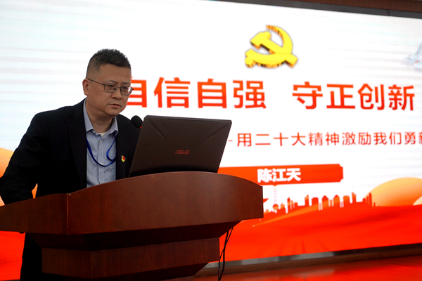 此次党课分两个部分。首先,党委书记陈江天紧紧围绕党的二十大报告内容,从深刻把握二十大的鲜明主题、过去五年的工作和新时代十年的伟大变革、新时代新征程中国共产党的使命任务、全面建设社会主义现代化国家的基础性战略性支撑等,全方面解读了党的二十大精神的核心要义和实践要求,重点学习了二十大报告中关于卫生健康事业发展的重要论述精神,并结合工作实际,提出了自信自强、守正创新、踔厉奋发、毅勇前行的工作目标与任务。他要求全院干部职工一定要学习宣传贯彻好党的二十大精神,传承好坚守奉献的麻防精神,用新时代“时代楷模”精神坚定新一代皮防人的事业自信,同时,要进一步增强忧患意识,把握时代机遇,攻坚克难实现医院“破茧化蝶”的重大蜕变,为把我院建成全国和省内一流皮肤病专科医院而努力奋斗。