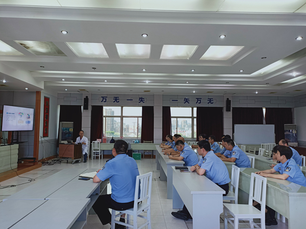在交警大队,我院院感科副主任兼外科副主任金新东,通过PPT向警员们讲解了心脏骤停期间身体发生的一系列变化以及由此产生的严重后果,强调了开展急救救援的重要性,并介绍了心肺复苏基本急救知识和操作方法以及AED体外除颤仪等医疗设备。
