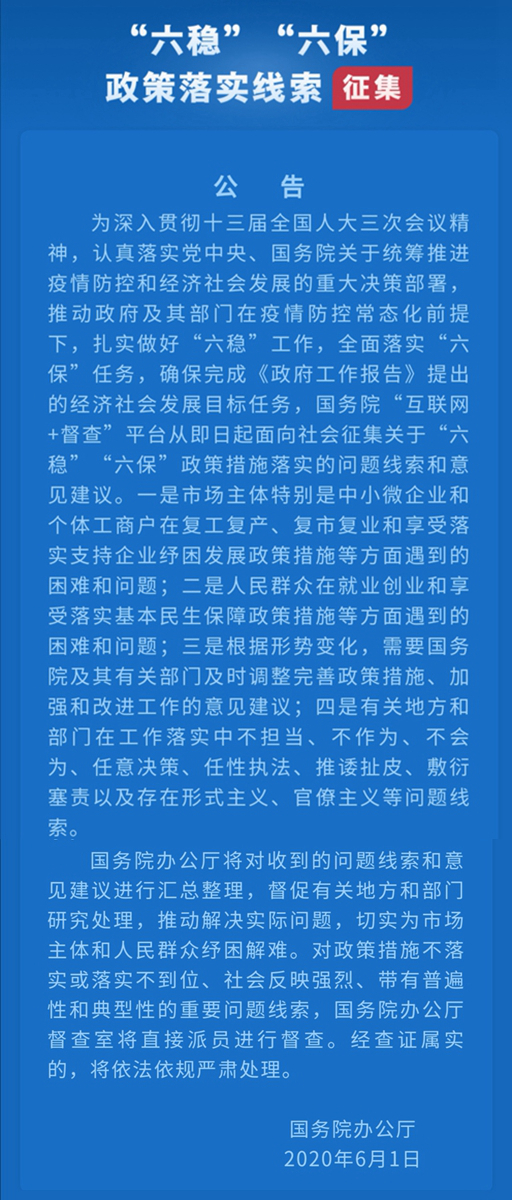 国务院“互联网+督查”平台公开征集关于“六稳”“六保”政策措..