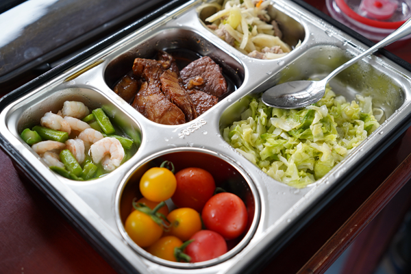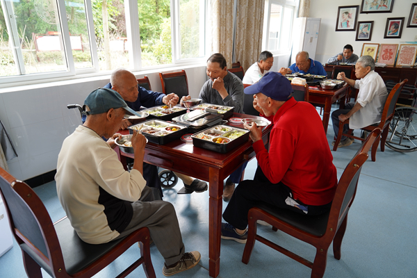 ▼活动室里,麻风休养员享用爱心营养餐