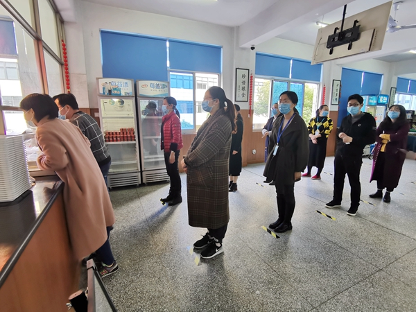 ▼食堂错峰就餐,实行打包制,人员排队间隔1米