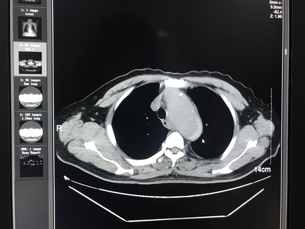 放射科医师范尚文为患者做了CT检查并出具了诊断报告,影像诊断显示:主动脉夹层可能。诊断后,范医师第一时间向科主任江毅军汇报,江主任随即将“危急值”告知施医师,并向医务科报告备案。施医师表示,主动脉是人体动脉的主干道,直接受到心脏泵出的血流冲击,使其内膜承受巨大的血流压力,一旦动脉内膜出现破损,这可是危及生命的“定时炸弹”。