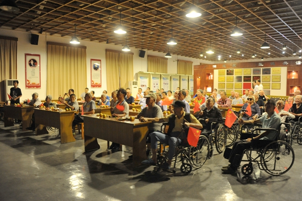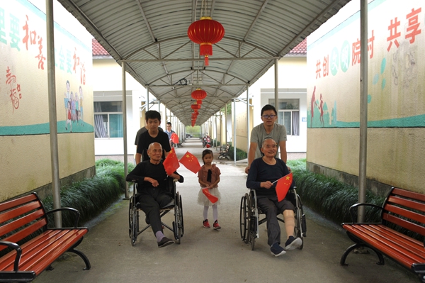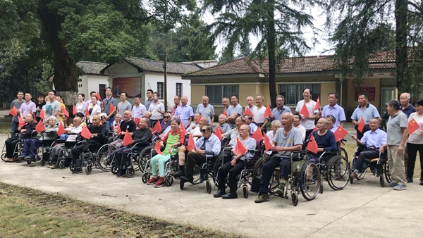 9点15分,可自己行走的麻风休养员不约而同的走出家门,来到升旗仪式现场;行动不便的麻风休养员由党员代表推着轮椅来到现场。一路上,大家自豪地挥舞着国旗,微笑着准备为祖国母亲庆生,喜悦之情溢于言表。在旗杆下,全体参加人员与五星红旗合影,用笑容为祖国献上最深切的祝福。