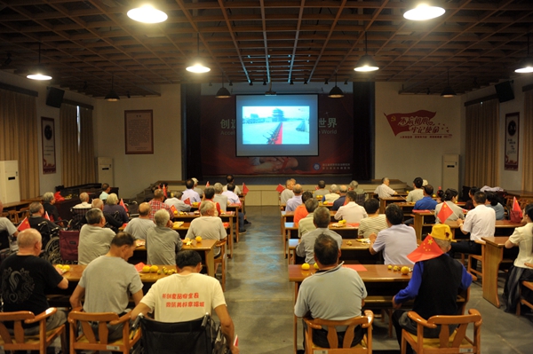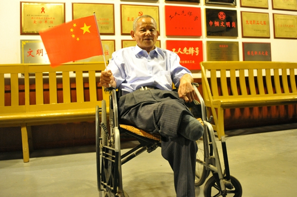 国歌响起时、习总书记讲话时、方队整齐亮相时……每看到激动处,麻风休养员们总会挥舞起手中的国旗表达内心的感动和喜悦。麻风休养员蔡水荣今年68岁了,手脚畸残的他坚持在轮椅上看完了全程,他残疾的手一直紧紧拽着五星红旗。