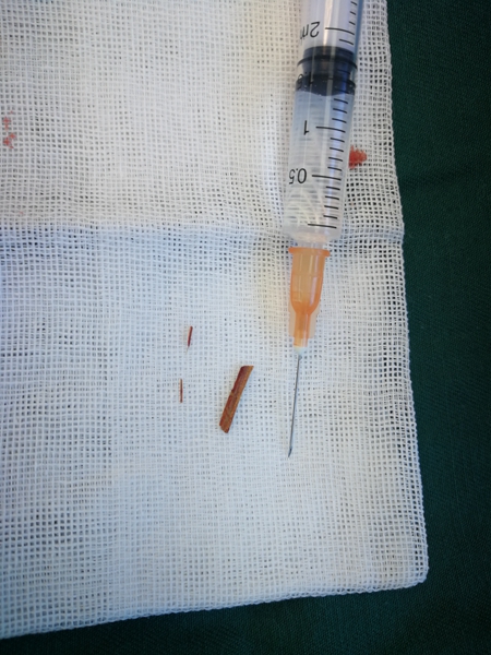 张大爷(化名)在家干活时,不慎被碎竹片刺伤手指。起初因症状不严重延误了治疗,直到3天后手指开始肿胀、疼痛,他才开始着急起来。辗转多家医院诊治均不见效,于是找到了我院外科医师金新东。经过仔细的询问病史和检查,金医师考虑手指并非单纯的炎症,有异物留存体内的可能,并给予手术探查。术中,金医师逐层解剖,仔细寻找,但是由于局部组织水肿严重,长时间未能发现异物的踪影。金医师没有放弃,而是及时调整思路,请B超医师前往手术室联合会诊,在床边B超机的协助下终于找到异物并顺利取出。他坚持不懈的耐心和对患者认真负责的态度赢得了患者的点赞。