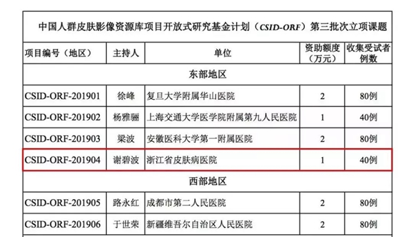 4月14日,中国人群皮肤影像资源库项目开放式研究基金计划(CSID-ORF)第三批次评审结果公布,省皮肤病医院喜获立项1项(由皮肤一科主任助理谢碧波主持)。中国人群皮肤影像资源库项目(CSID)在2017年8月正式启动开放式研究基金计划,旨在推动我国在皮肤影像领域的科学研究,聚焦解决各种皮肤影像技术中存在的科学问题、应用问题及解决方案,同时促进相关领域研究成果发表或申报专利,参与研究单位一般为在我国早期开展皮肤影像研究的中心城市三甲大型医院,第三批次CSID-ORF于2018年2月20日正式启动,此次能够顺利通过高标准评审,表明我院皮肤影像研究团队得到了国内同行的认可,本项目为我院皮肤病学科第一次横向参与全国研究基金项目,随着研究深入开展必将推动皮肤影像在浙江健康发展。