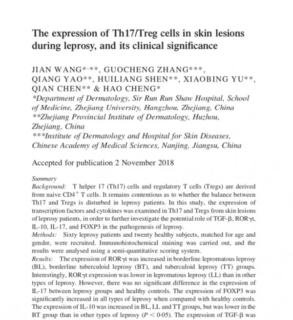 此外,皮肤一科医师王涧撰写的论文《Th17和Treg细胞在麻风皮损中的表达及其临床意义The expression of Th17/Treg cells in skin lesions during leprosy and its clinical significance》在英国SCI期刊<麻风评论Leprosy Review>上发表,该研究项目对60例麻风患者及20例健康对照组皮肤标本进行了免疫组化染色,并检测相关转录因子和细胞因子在皮损中的表达,结果证实了Th17和Treg细胞相关转录因子参与了麻风相关发病机制,为进一步揭示麻风病发病机制提供了新的线索。