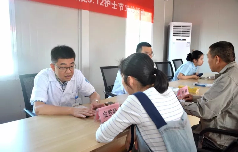 义诊过程中,医生在与工友们交谈中发现他们长期在建筑工地上工作,几乎没有走出过这片区域。头戴安全帽的王大叔对皮肤科医生说:“最近天气有点热,我们工作容易出汗,皮肤有点痒,由于工期紧张,平时也没有时间去医院看病,没想到你们直接来我们工地上义诊,真的是太感谢了。”医生细心地给王大叔讲解病情,并提醒他平时注意皮肤清洁。
