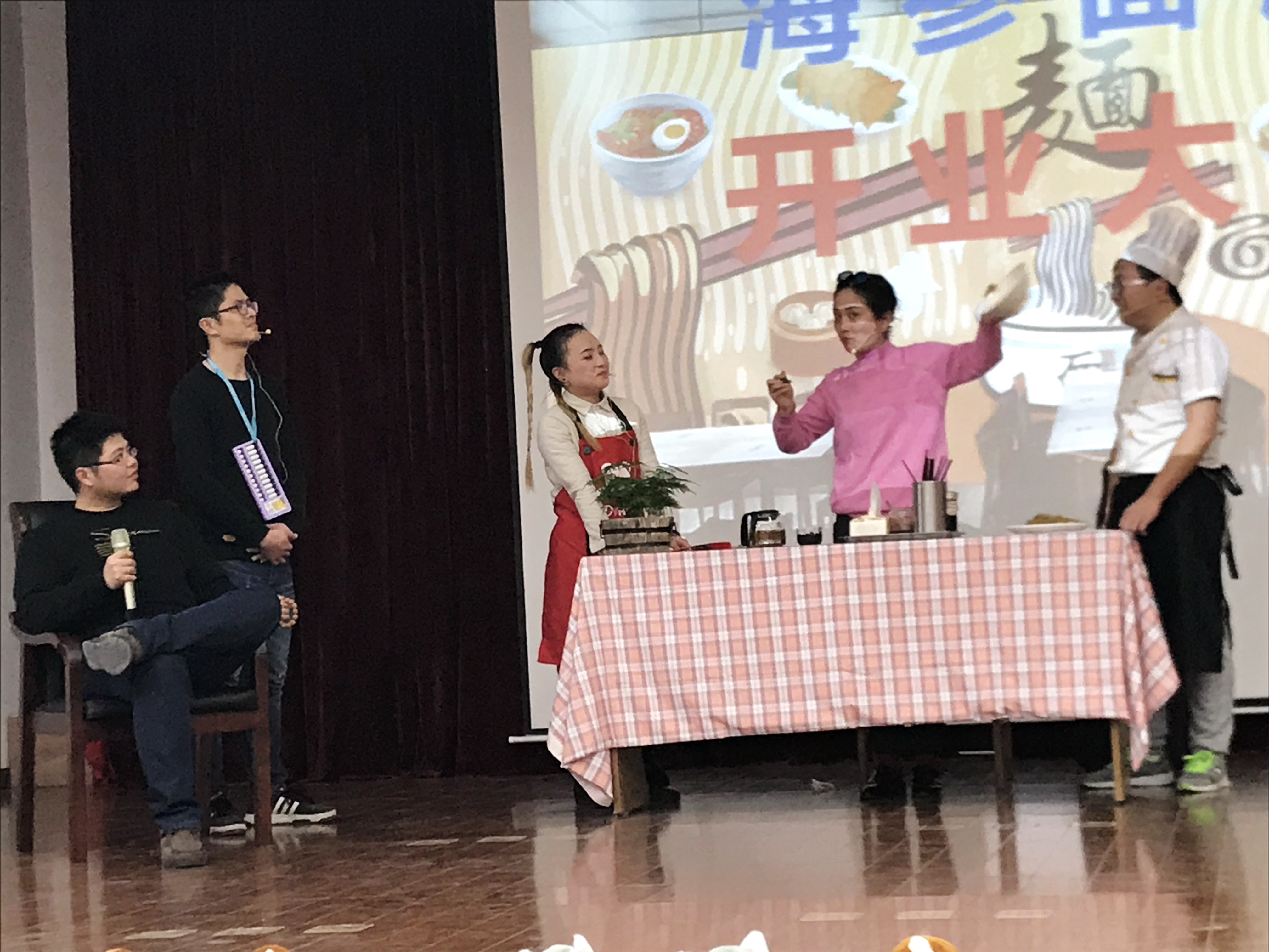 在场观众的热情在笑料百出的小品《吃面》中不断延续。这个小品是单位小品女王吴佩华继前两年小品《相亲》后再次登台,由她带领人事科、总务保卫科的年轻人搞笑出演。