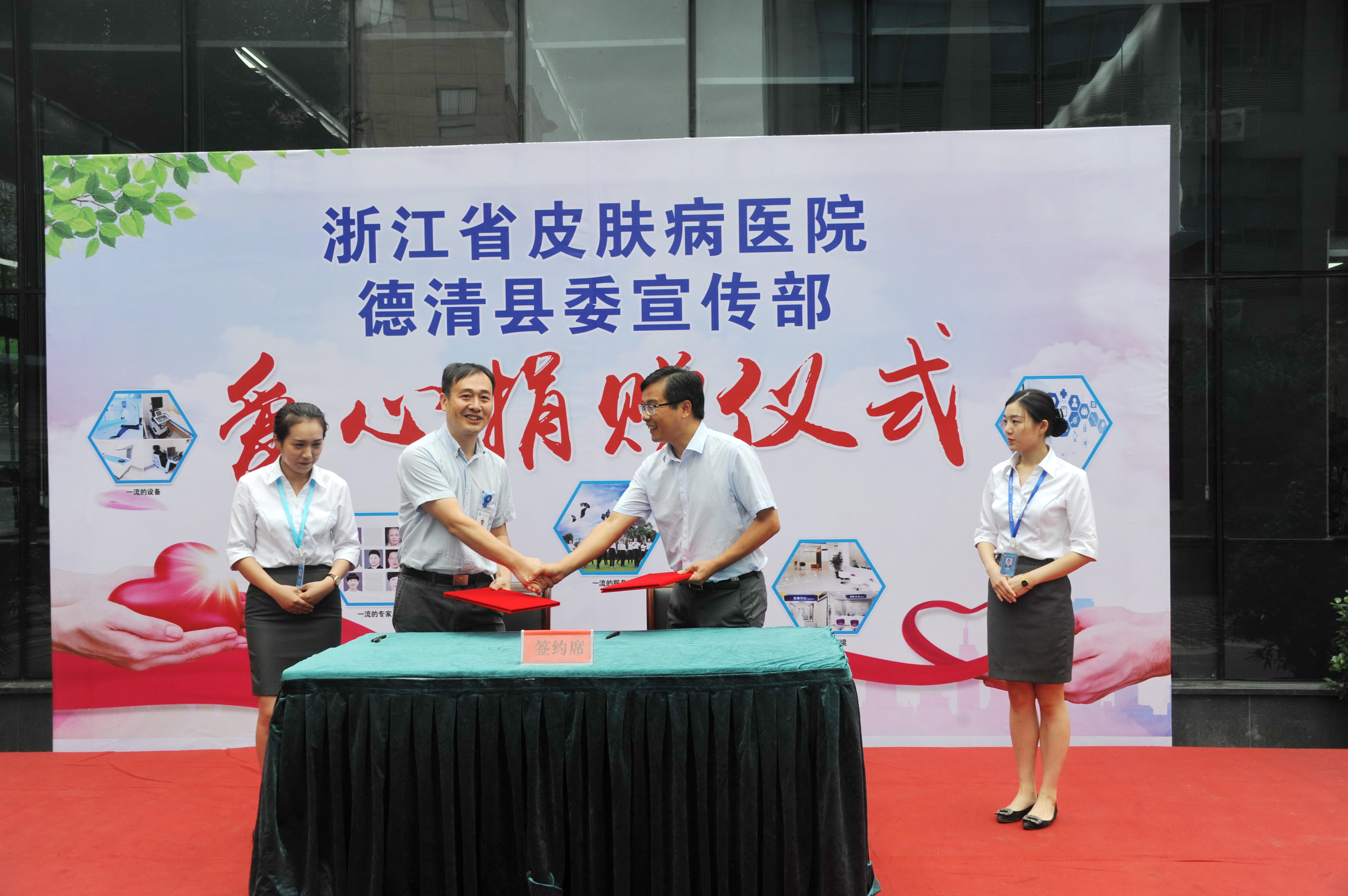 2017年9月11日,浙江省皮肤病医院与县委宣传部举行了爱心捐赠仪式。省皮肤病医院为德清县内省级及以上道德模范、民间设奖人免费提供了健康体检服务。县委宣传部副部长朱晓华、县文明办主任陈磊、副主任徐国新以及德清县内省级及以上道德模范参加了此次仪式。