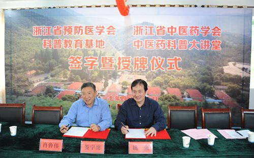 姚强院长分别与叶真会长、肖鲁伟会长签订成立“浙江省预防医学会科普教育基地”和“浙江省中医药学会中医药科普大讲堂”协议,同时进行了揭牌仪式。