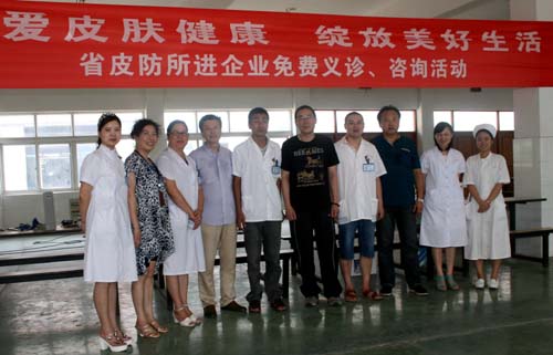 7月23日,在这炎炎的夏日里,我所医教科组织皮肤科、内科、外科、美容理疗中心的医务人员一行10人,利用午休时间,顶着骄阳,来到了德清经济开发区的浙江千鹤工艺品公司,为来自安徽、四川、贵州等地的德清新居民开展以“关爱皮肤健康绽放美好生活”为主题的免费义诊、咨询健康宣教、有奖竞答活动。