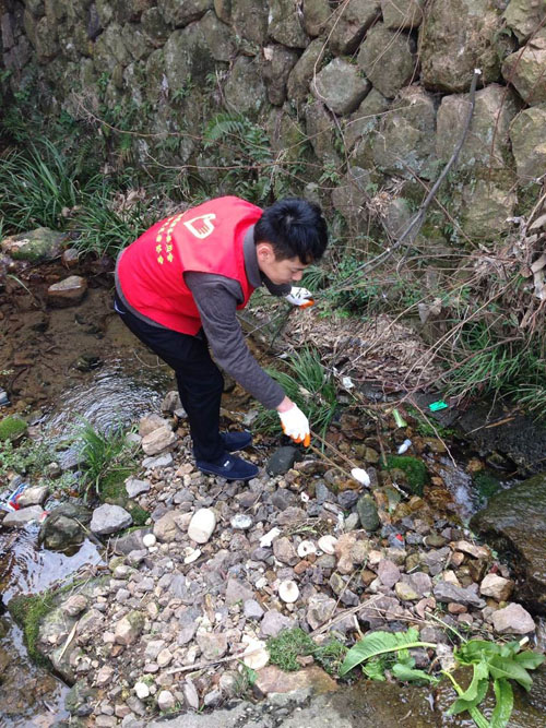 共青团员们手拿竹钳、垃圾袋,沿着紫岭溪、劳岭溪两条对河口水系,至上而下捡拾沿溪垃圾,同时向沿溪当地村民发放倡议书和宣传资料,宣传爱护水源的重要性,传递环保理念以及传播水源性疾病防控知识。