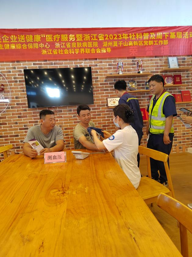 为深入学习贯彻党的二十大精神,更好地为深入实施“八八战略”、奋力推进“两个先行”、努力打造“重要窗口”贡献卫生健康力量,浙江省皮肤病医院、浙江省卫生健康综合保障中心、湖州莫干山高新区党群工作部于2023年6月2日联合举办“学思想践行动进企业送健康”医疗服务暨浙江省2023年社科普及周下基层活动,浙江省皮肤病医院-医学美容岗岗员刘盾、梁露元等参加了此次活动,为企业员工测量血压、科普咨询送去优质医疗服务,普及健康生活方式,受到广大员工的欢迎和好评。