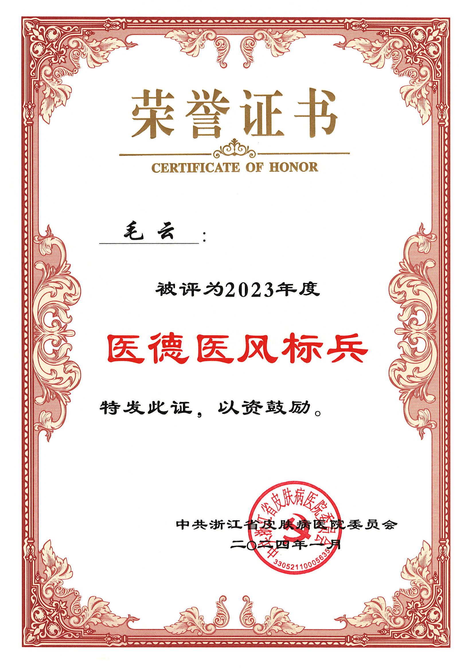 岗员毛云被评为2023年度医德医风标兵