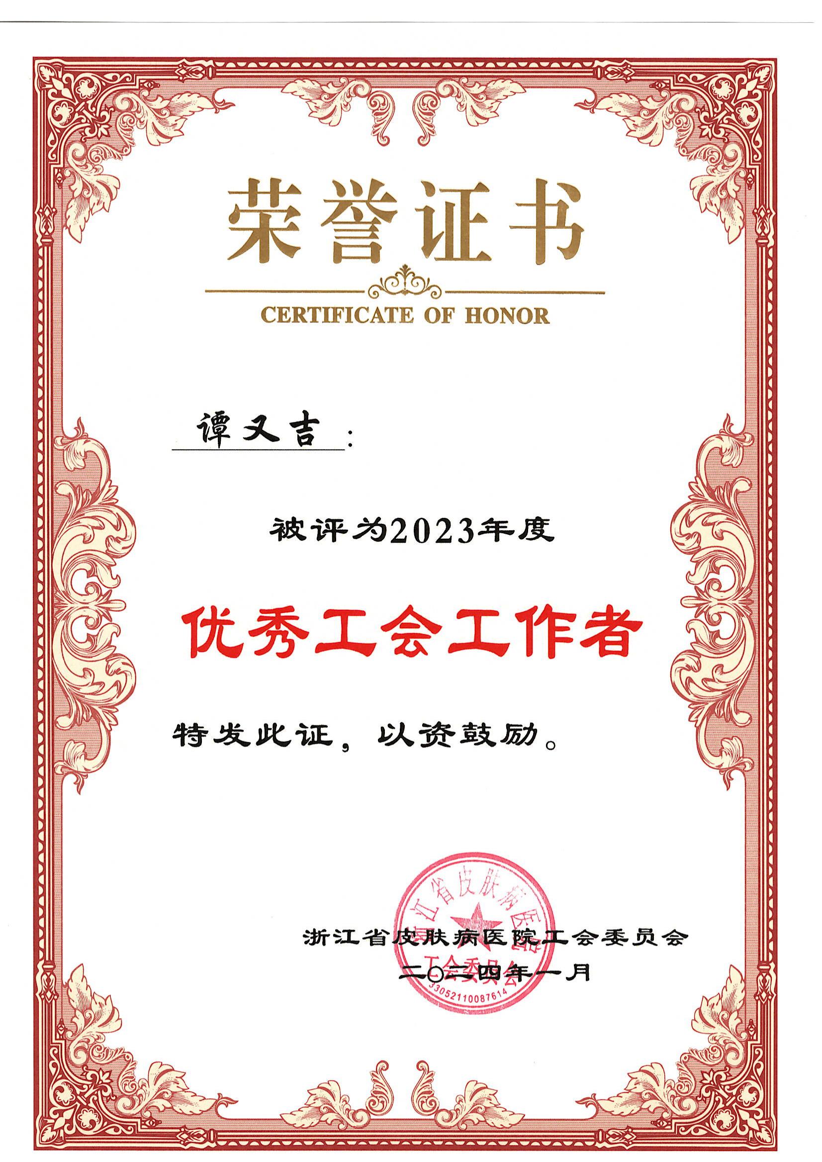 谭又吉被评为2023年度优秀工会工作者