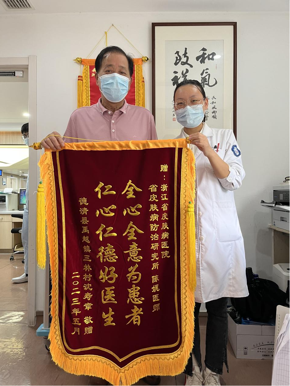 2023.5.31皮肤病患者沈寿章向陈娓医师赠送锦旗合影留照。