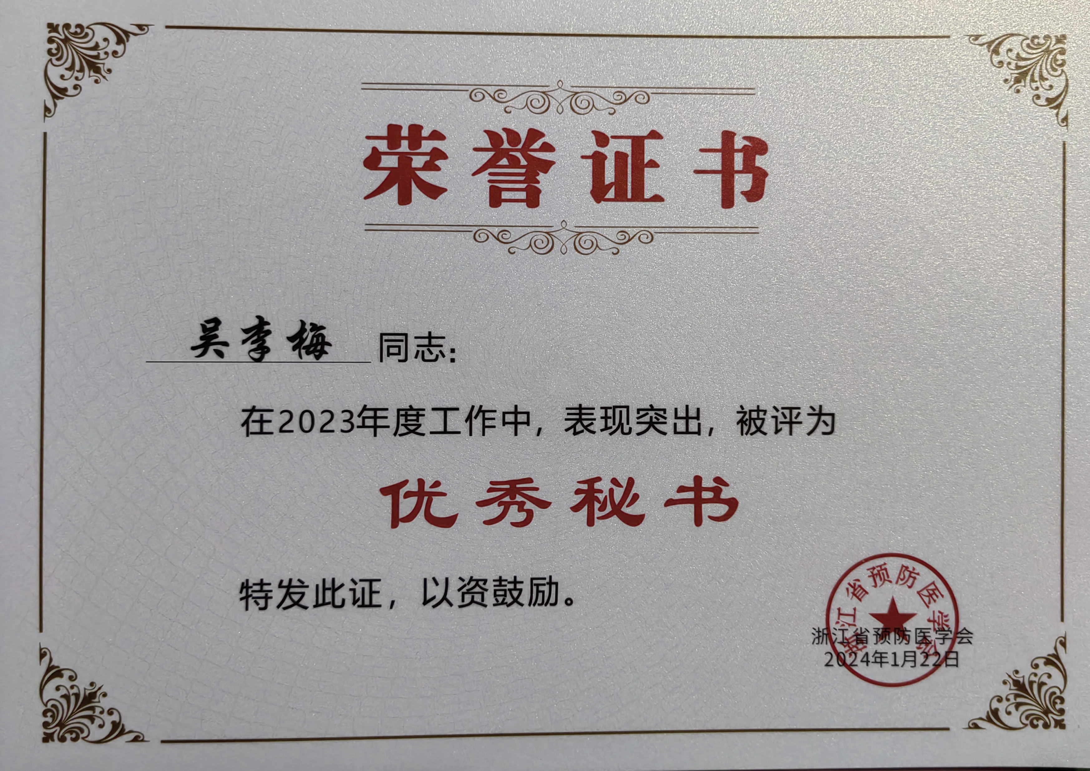 岗长吴李梅被评为浙江省预防医学会优秀秘书