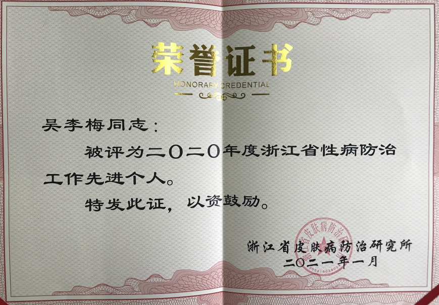 岗长吴李梅获2020年全省性病防治工作先进个人