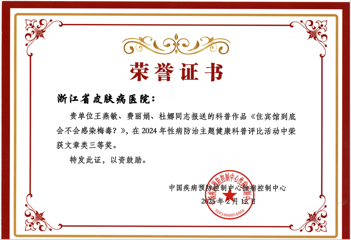 岗员王燕敏、费丽娟、杜娜在2024年性病防治主题健康科普评比活动中荣获文章类三等奖..