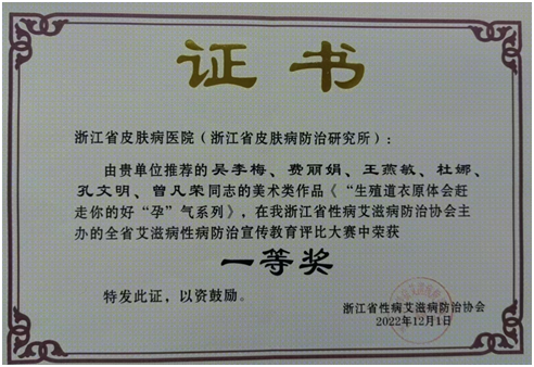 2022年12月,公共卫生防治岗报送的《生殖道沙眼衣原体会赶走你的好“孕”气系列》和《得了性病,警惕艾滋找上门系列》在浙江省性病艾滋病协会主办的全省艾滋病性病防治宣传教育评比大赛中分别荣获一等奖和二等奖。