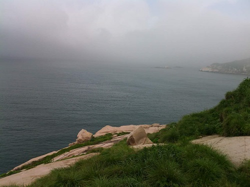 半夜,听到大雨的哗哗声,雷电的轰鸣声,心想他们约好早上的海钓还能成行吗?果不其然,大雨、雷电、大风把我们全留驻在房间里休息。一直到上午10点,雨渐小,天气慢慢放晴了,导游带我们去环游庙子湖的山顶。我们十几人前呼后拥地沿着古老的街道,拾阶参观东极岛博物馆、东极岛渔民画展览馆、山上直升机的机坪。并沿着山路来到东翔亭,看到了大海的另一边,远远望去,层层叠叠,高低错落,犹如海面上突兀而起的海市蜃楼,故被称为“海上布达拉宫”。不远处还有一座叫情人岛,岛已经被私人购买,将建成海上的高档会所,据说,岛上还有几位七八十岁的老渔民驻守在那里,不愿意离开故土。极目远眺,眼界开阔,我不禁好奇地问:“这里离公海多少海里?”导游说:“有12海里。”