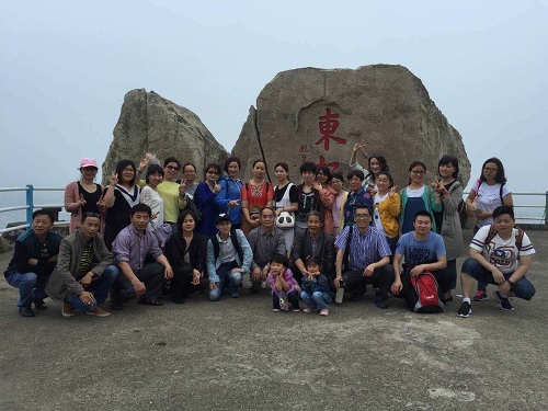 东福山岛到了,导游说东福山名称来由,据传与秦时方士徐福出海寻丹有关,徐福为求仙药,往东一直到这里才找到一点仙气,“徐福至此”因此而得名。东福山是东极最高的一座山,临大海,悬崖,岩峰众多,周围海水清澈,主峰常有白云笼罩,山、水、云、石融为一体,素有“风的故乡、雨的温床、雾的王国、浪的摇篮”之称。东福山的礁石海滩是诱人的,整个小岛的沿海礁石和海滩,看上去是那么干净,白净的石山,连着海水部位的褐色海滩,深蓝色的大海,以及风浪不大的白色浪花,不时点缀着岩石中的绿色植物、灌木和漫山的野生金银花,还有山羊在海边放牧。我们一行上山时,天空突然拨开云雾阳光普照,当我们个个满头大汗爬上中国看到第一缕曙光的观日台,我们兴奋地叫导游给我们留下了这美好的一瞬间。