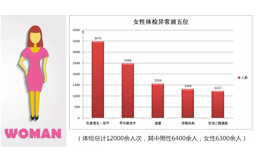 2018年,浙江省皮肤病医院健康管理中心(浙江省人民医院浙北健康管理中心)共完成体检总计12000余人次,其中男性6400余人,女性6300余人。健管中心分析了1.2万+德清人的体检大数据,那么,上万人的体检报告隐藏着什么危机?男性和女性体检异常前五位你中招了吗?你对自己的身体状况了解吗?