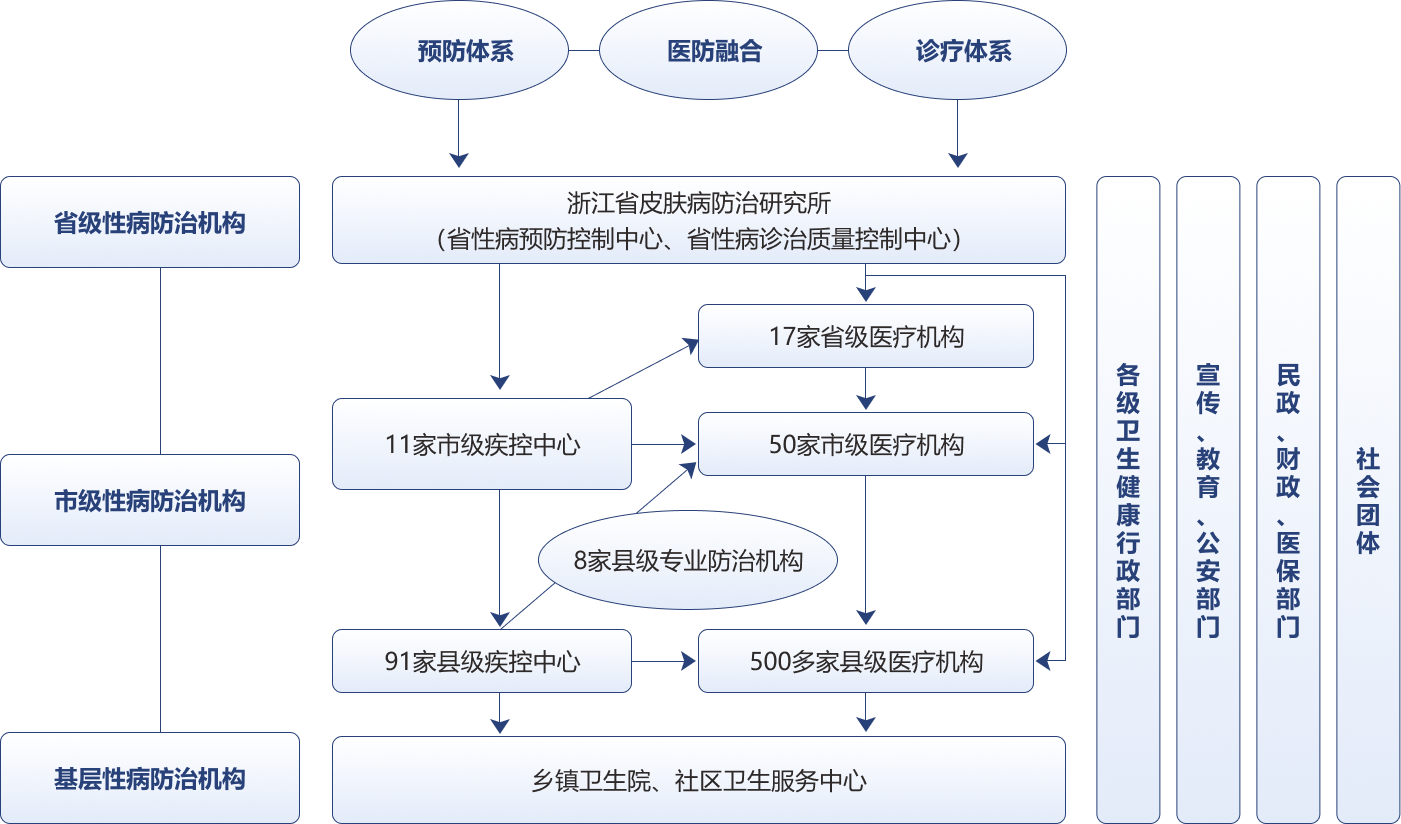 浙江省以“医防整合”为手段,不断完善和巩固性病防控网络,形成了卫生健康行政部门负总责,性病防控机构负责业务管理,性病诊疗机构和各级各类医疗机构开展监测、检测和规范诊疗的防控网络。目前,全省性病防治专业机构8家(其中省级1家,县区级7家)、疾控中心96家(其中市级11家,县区级85家)。建立了省市县三级性病实验室检测体系。2016年成立浙江省性病诊治质量控制中心后,融合预防控制机构和医疗机构的相关职能,进一步强化了性病防治网络。2023年浙江省卫生健康委等七部门联合印发《浙江省预防与控制性病传播行动计划(2023-2027年)》,进一步完善全省性病防治网络。