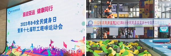 在这个充满活力和激情的8月,在莫干山脚下的五四村运动工厂内响起了激烈的加油声、欢呼声、呐喊声,浙江省皮肤病医院2023年8▪8全民健身日暨第十七届职工趣味运动会在这里隆重举行。院领导、医院职工等近160人参加本次趣味运动会,运动会设有定点投篮、尾巴爆炸、飞越摘星三个团体项目,充分体现了全民参与、团结协作、激发动力、共享健康的运动会宗旨。