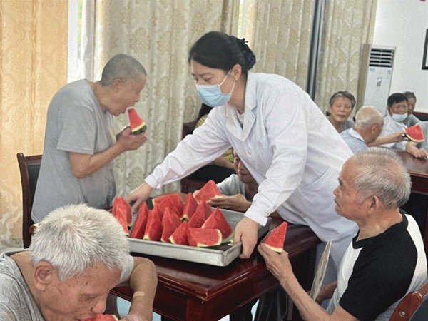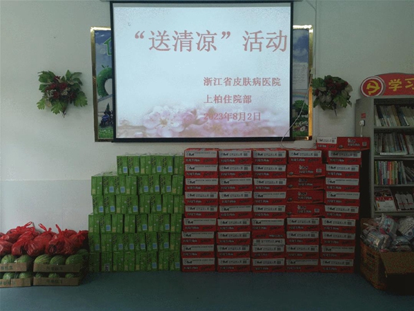 三伏天,气温居高不下,枝繁叶茂的香樟树下也透着热意。麻风村的活动室里,慰问组一行一起为麻风休养员们送上牛奶、鸡蛋、香皂、毛巾等慰问品,还为他们端来了清凉解暑的西瓜,让每一位麻风休养员在炎炎夏日感受到一份清凉。副院长潘美儿叮嘱休养员们,在持续高温天气下要预防中暑,合理膳食,台风天或雷雨天时尽量不要出门,如有需要及时与医务人员联系。有休养员说,西瓜不仅吃着解暑,还甜到了心里。
