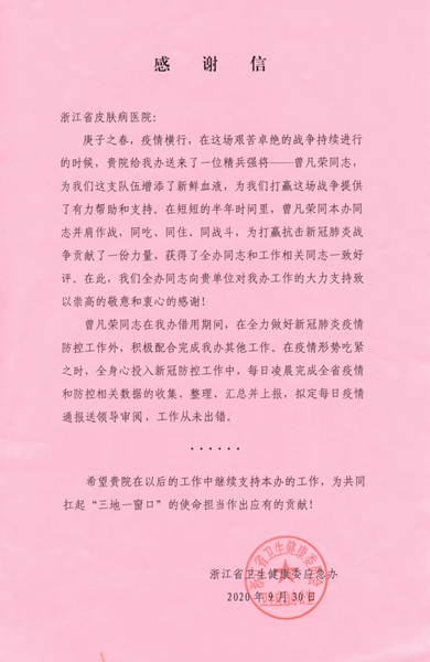今年4月,我院选派防治科曾凡荣同志到省卫健委应急办,支援新冠肺炎疫情防控工作。他现从事麻风病性病防治工作,是新时代的“麻防人”,曾有浙江省现场流行病学培训班学习经历,以及十余年传染病应急处置工作经验。