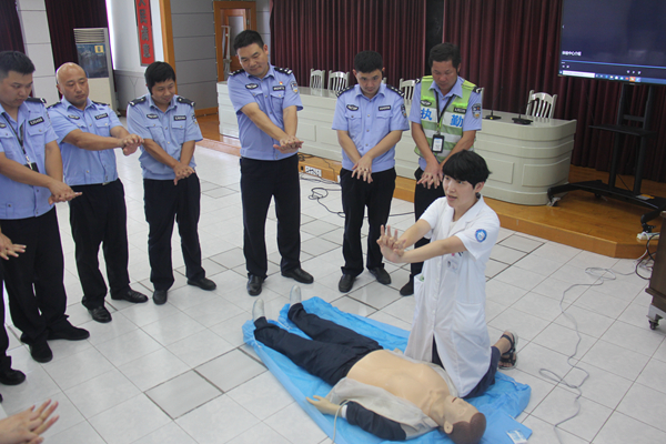在交警大队,我院院感科副主任兼外科副主任金新东,通过PPT向警员们讲解了心脏骤停期间身体发生的一系列变化以及由此产生的严重后果,强调了开展急救救援的重要性,并介绍了心肺复苏基本急救知识和操作方法以及AED体外除颤仪等医疗设备。