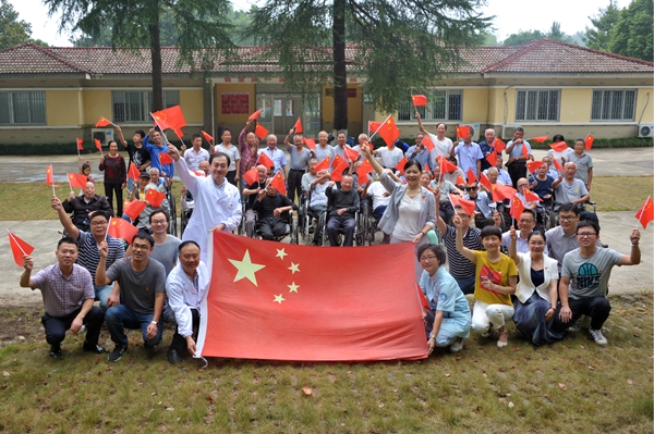 9点15分,可自己行走的麻风休养员不约而同的走出家门,来到升旗仪式现场;行动不便的麻风休养员由党员代表推着轮椅来到现场。一路上,大家自豪地挥舞着国旗,微笑着准备为祖国母亲庆生,喜悦之情溢于言表。在旗杆下,全体参加人员与五星红旗合影,用笑容为祖国献上最深切的祝福。