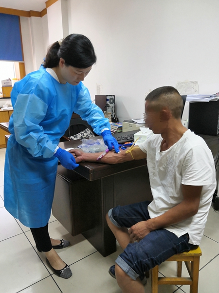 访视过程中,服务队成员详细了解老沈的病情及治疗过程中存在的问题,现场测试老沈的手足肌力和功能,采集了血液样本,并手把手教授老沈手足功能锻炼的要领,进一步提高麻风病人手足麻木的抗损伤能力。