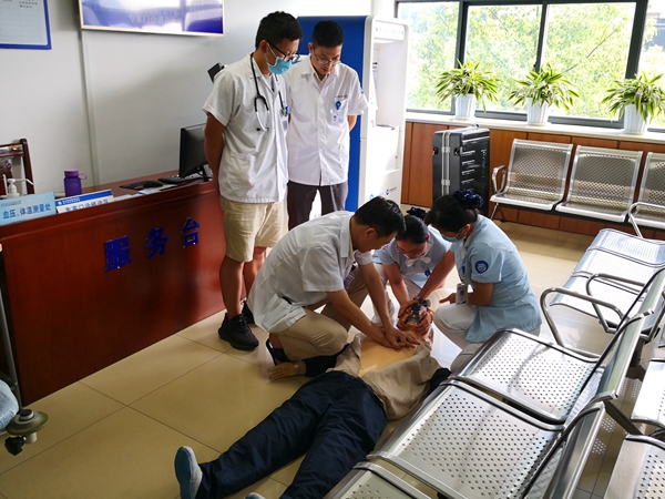8月16日下午,我院医务科、门办、护理部在门诊3楼候诊室,模拟候诊患者突发休克,进行了一次联合急救演练。