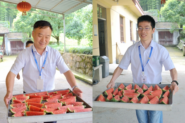 7月11日上午,副院长沈云良代表党政班子成员和爱心企业相关负责人一同来到了上柏住院部,满足了休养员的“红色”愿望,为他们送上投影仪和幕布,同时送上了清凉解渴的西瓜。上柏住院部医务人员共同参与捐赠仪式。