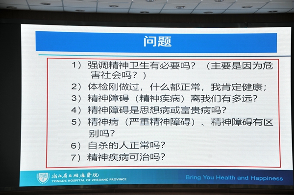 章副院长从心理健康的概念、常见精神障碍、心理压力与调适三个方面对精神卫生和精神健康作了详细的阐述和讲解。同时,运用大量研究数据和科学理论对当今社会精神健康面临的严峻形势进行了说明,指出抑郁症、精神障碍已成为严重影响人们身心健康的重要问题,疾病负担不断增大。对于社会上普遍存在的职业压力,章副院长深入分析了压力产生的原因及各种影响因素,并采用实例的形式提出缓解职业压力的应对措施。最后,他从健康的定义方面强调,精神健康是人类健康重要的组成部分,呼吁大家重视和关注精神卫生问题。