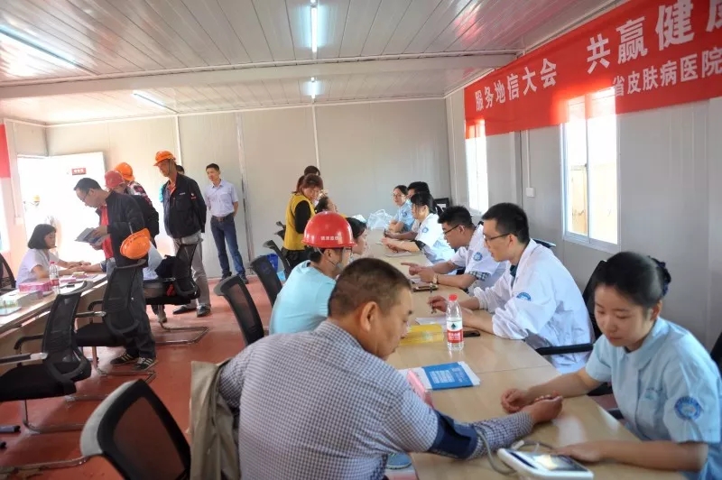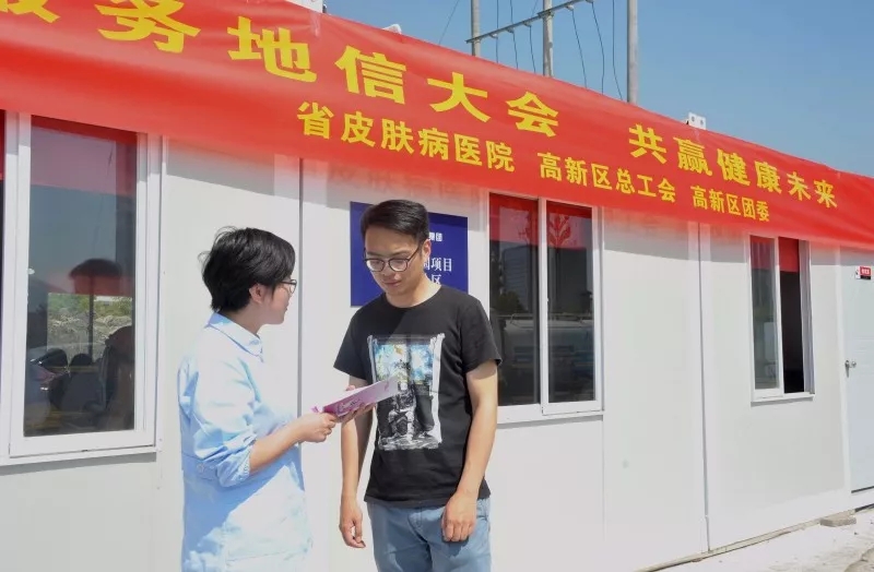 义诊过程中,医生在与工友们交谈中发现他们长期在建筑工地上工作,几乎没有走出过这片区域。头戴安全帽的王大叔对皮肤科医生说:“最近天气有点热,我们工作容易出汗,皮肤有点痒,由于工期紧张,平时也没有时间去医院看病,没想到你们直接来我们工地上义诊,真的是太感谢了。”医生细心地给王大叔讲解病情,并提醒他平时注意皮肤清洁。