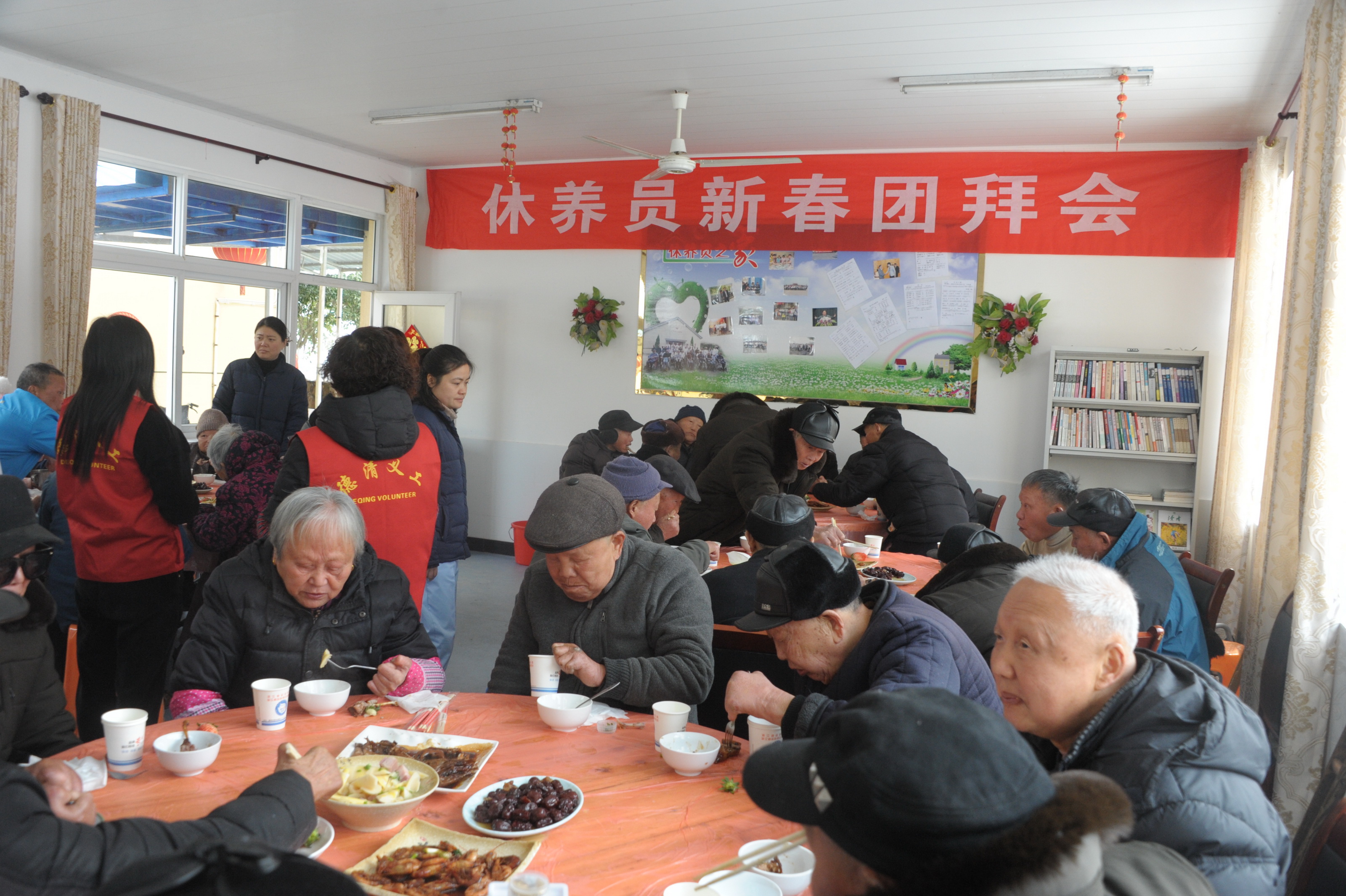 由于部分休养员行动不便,所领导和上柏住院部的医护人员推着小车将一份份热气腾腾的饭菜送到他们的房间。团拜会现场,“扣子给你扣好了,来,我给你夹菜”,上柏住院部护士长潘美儿弯下腰帮休养员双手不便的顾大爷扣好扣子,然后在他碗里夹了鸭肉。休养员李大爷握住医护人员的手,暖心的话语涌上心头,他一个劲的说“谢谢你们这样用心的照顾我们。”在休养员眼里,上柏住院部的医护人员是最最可爱的人。活动室内欢声笑语传递着祥和喜庆的新春气息。
