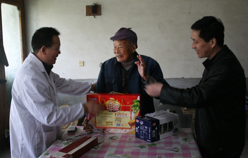 最后,卜副所长代表卫技党支部学雷锋小组给老人送上了牛奶、维他奶等营养礼品,并祝他健康长寿,老人感动地紧紧握着卜副所长的手连声说:“感谢党,感谢政府,谢谢你们对麻风病人的关心!”