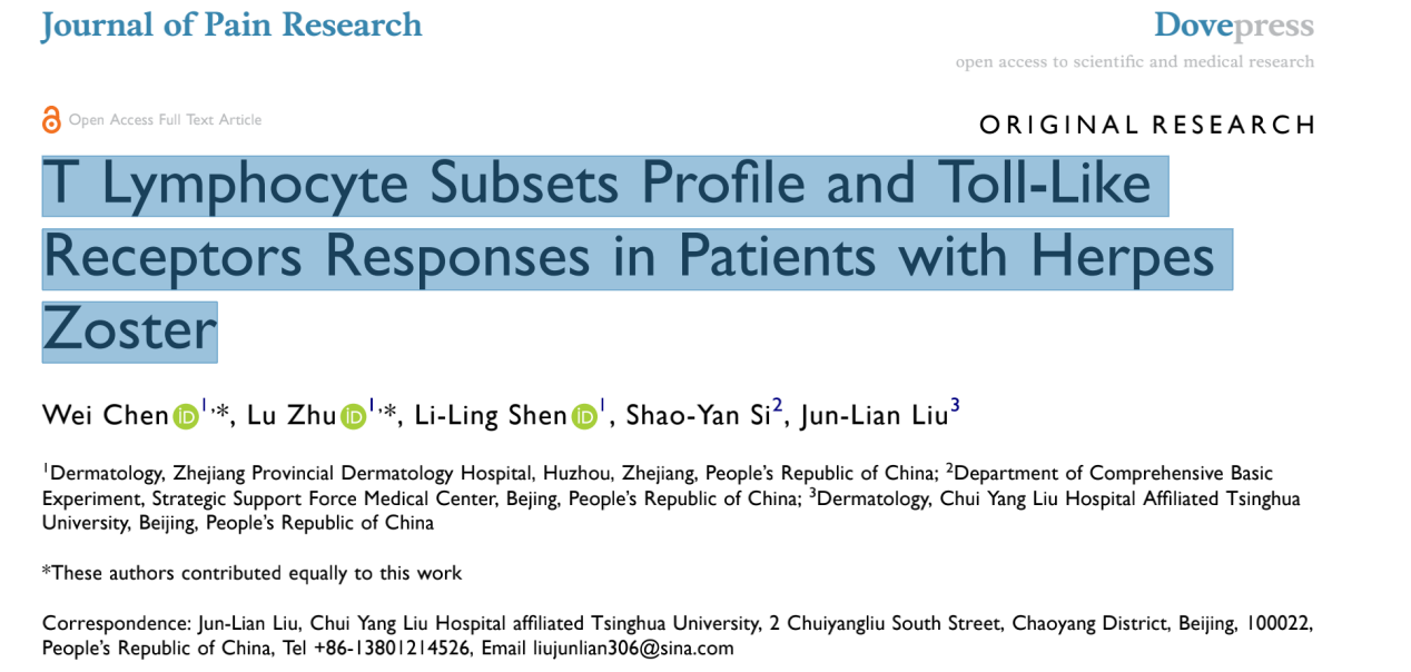 岗员陈娓医师予2023.05在Journal of Pain Research期刊(IF:2.83)上发表SCI一篇,题目为《T Lymphocyte Subsets Profile and Toll-Like Receptors Responses in Patients with Herpes Zoster》。
