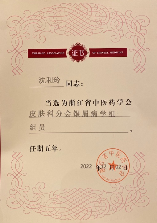 医学美容中心岗岗员沈利玲于2022年12月3日当选浙江省中医药学会皮肤科分会银屑病学组组员。
