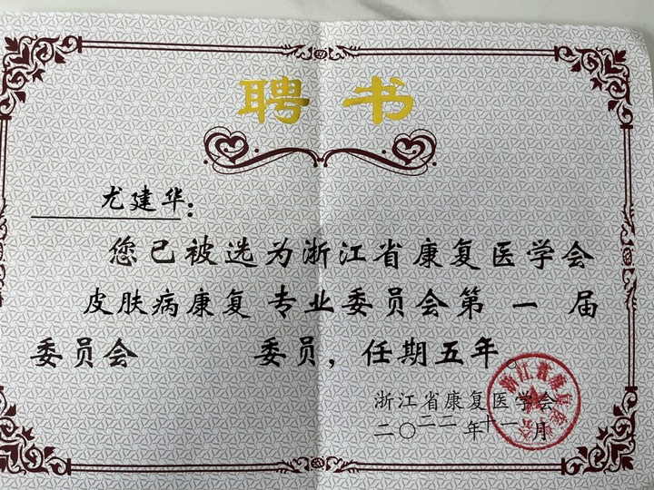 2022年11月尤建华副主任医师被聘为浙江省康复医学会皮肤病康复专业委员会第一届委员会委员。