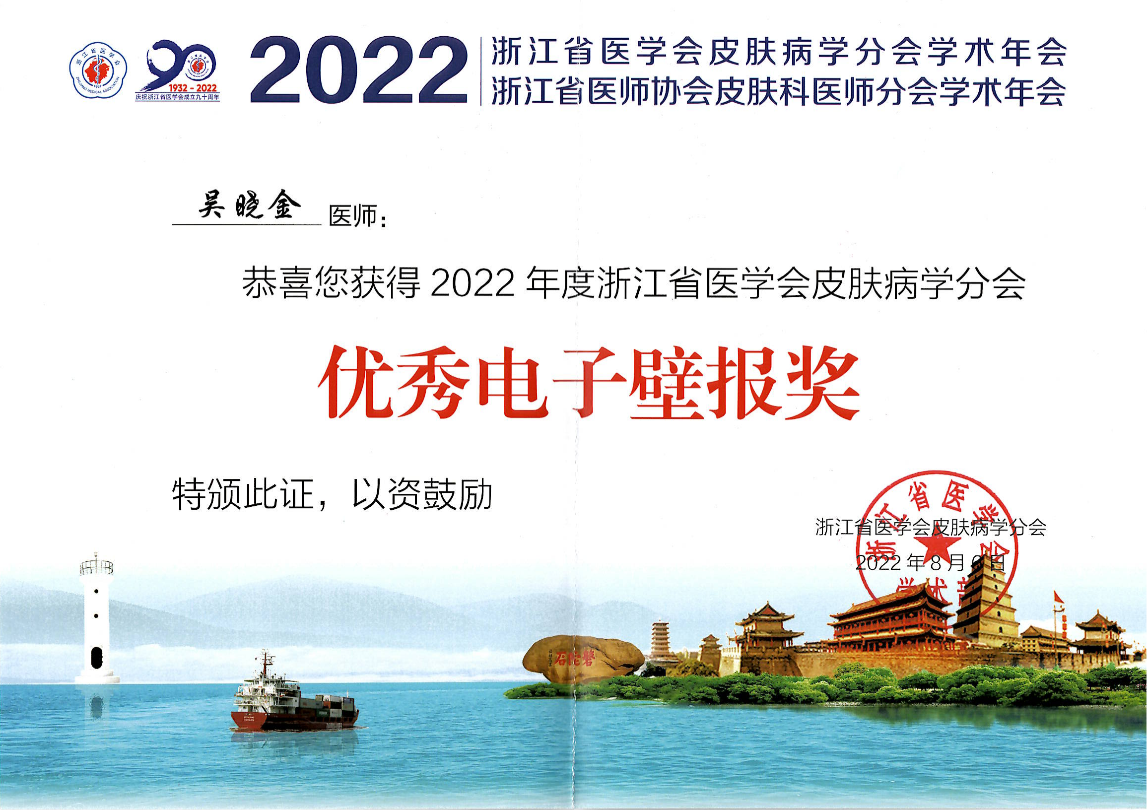 岗员吴晓金荣获浙江省医学会皮肤病学分会优秀电子壁报奖