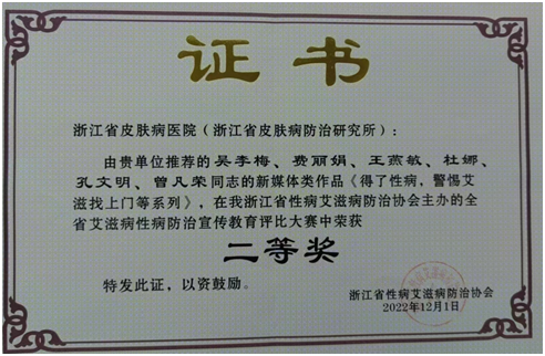 2022年12月,公共卫生防治岗报送的《生殖道沙眼衣原体会赶走你的好“孕”气系列》和《得了性病,警惕艾滋找上门系列》在浙江省性病艾滋病协会主办的全省艾滋病性病防治宣传教育评比大赛中分别荣获一等奖和二等奖。