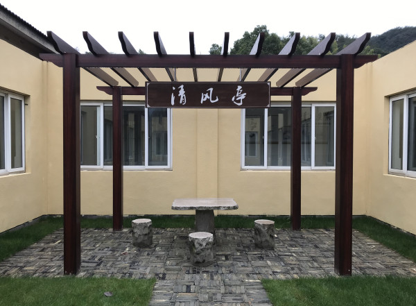 四合院以清风亭,悬挂廉政短语,种植荷花和青竹烘托廉政主题。