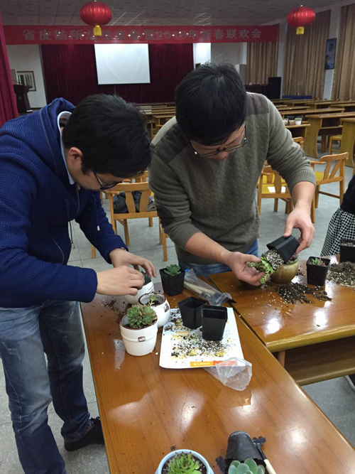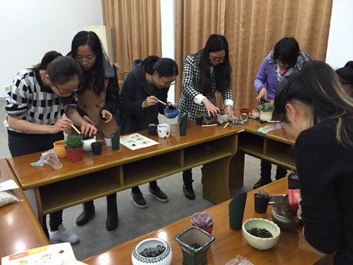活动现场摆满了各式各样的花盆、园艺三件套、混合种植土、铺面石及多肉植物。多肉植物有龙鳞、冬云、十二指天、玉珠莲、白美人、乙女心、艾格尼丝玫瑰等。现场由王超霞讲解多肉植物的习性和栽植技巧,大家挑选自己喜欢的多肉植物,再将其种入花盆中。活动过程中,大家有说有笑,气氛融洽,对自己亲手栽种的作品甚是满意,不时的拿出手机记录下这美好地时刻。